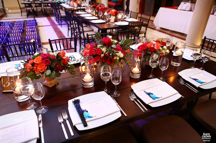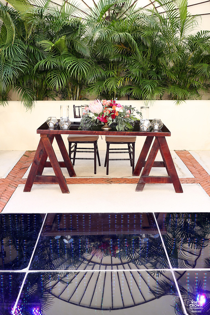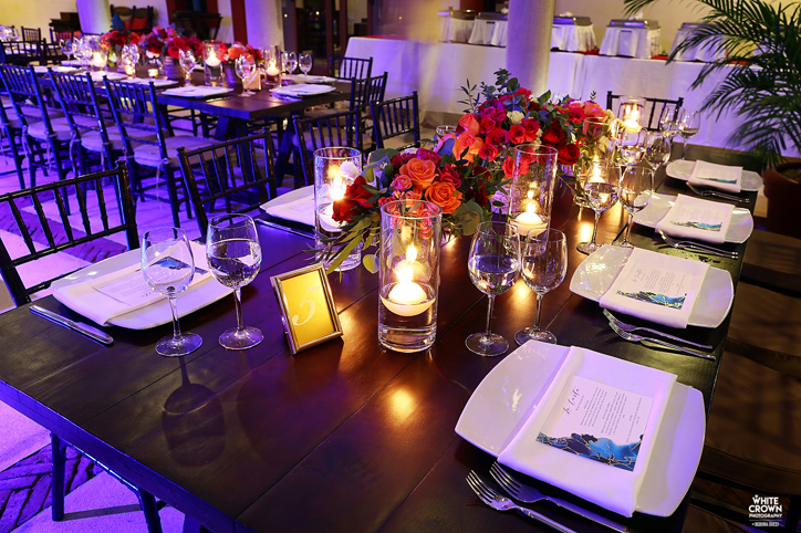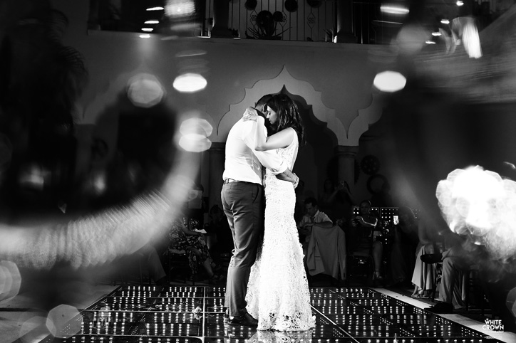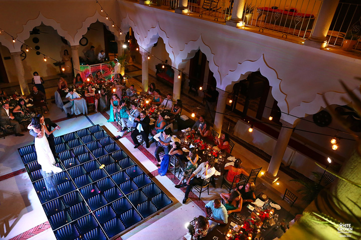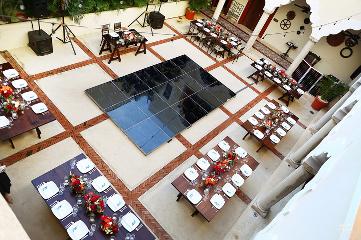 While laughs were being shared and photos taken, we ensured that every last detail in the main courtyard was perfect for the wedding dinner to commence. Each table was lined with flickering candles and vibrant floral centerpieces by Vanessa Jaimes. In the middle, a large LED dance floor awaited the arrival of the wedding party, and boy did they make the most of it. Each bridesmaid and groomsmen made their grand entrance, dancing in twos across the dance floor and over to their seat until it was the turn of our loved up bride and groom. Danusia and Michael floated into the courtyard with the biggest smiles on their faces and enjoyed a rather energetic first dance before taking their places at the head table.