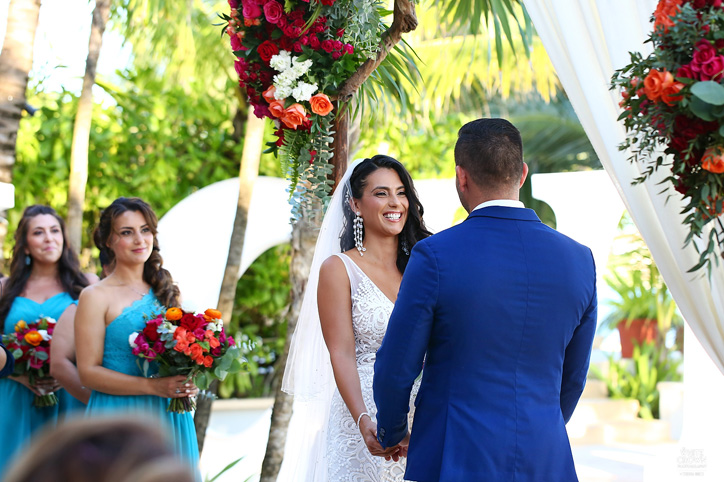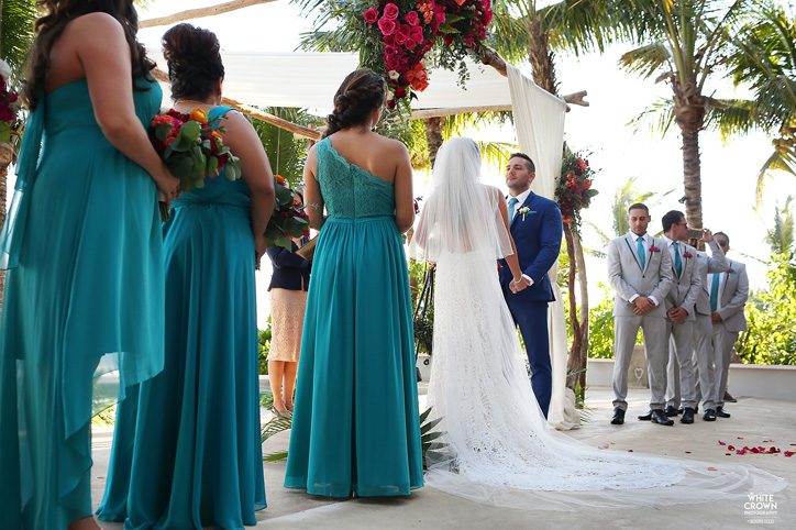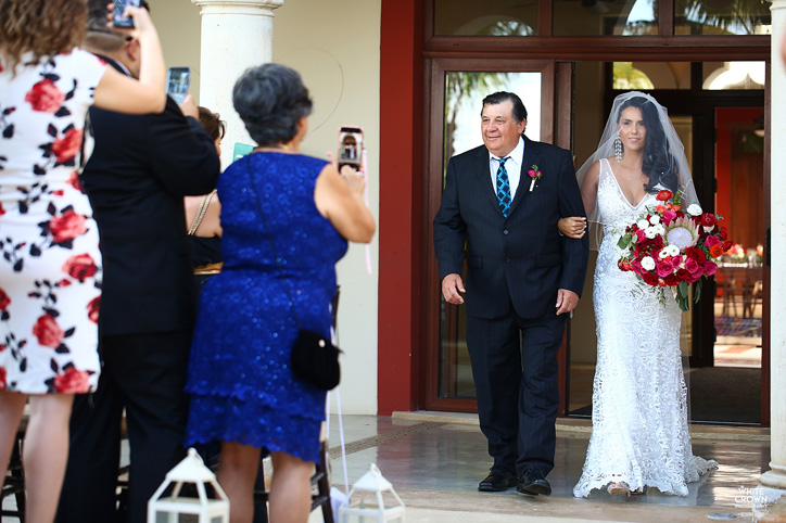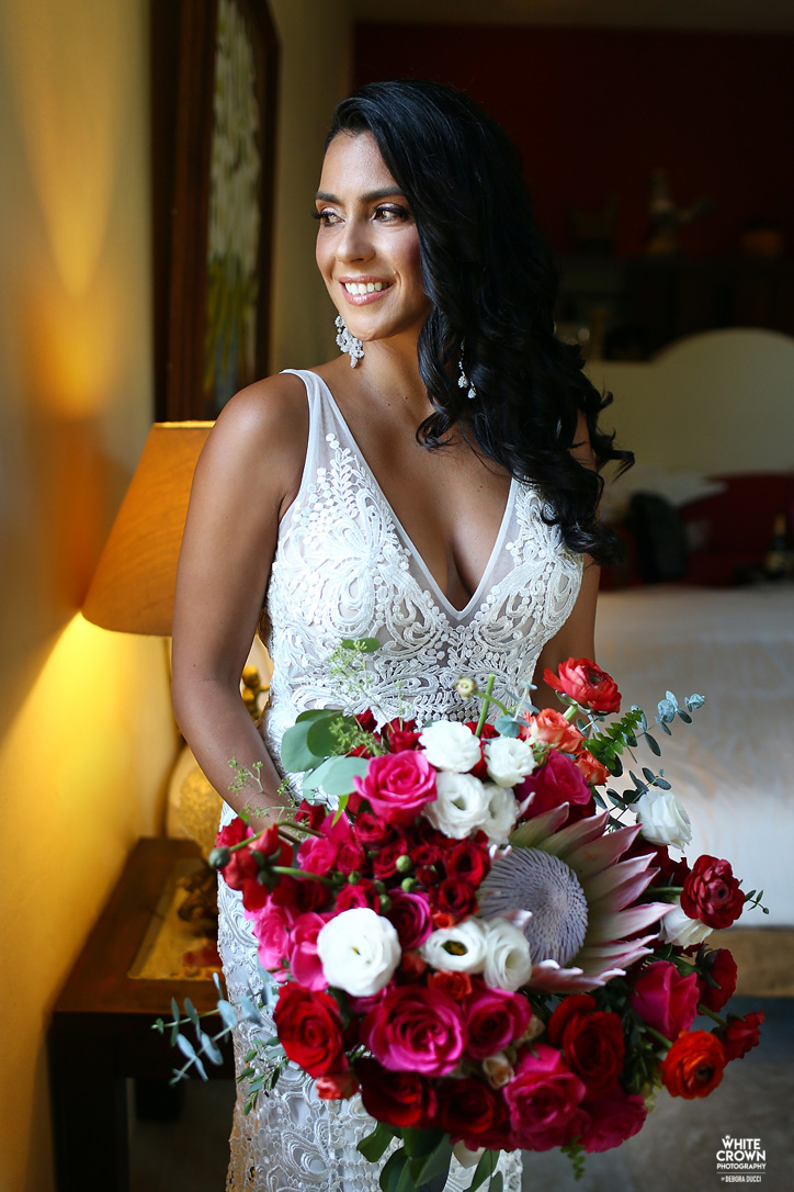 Michael stood, waiting for his blushing bride, under an elegant flower studded arch, overlooking the glittering ocean. As the bridesmaids made their way down the aisle, their bouquets of burnt orange and red gave an impressive pop of color against their flowing turquoise dresses, much like a sunset exploding over the shimmering sea. Once the wedding party were all seated, Danusia appeared like a vision in white from the hacienda’s ornate main door.