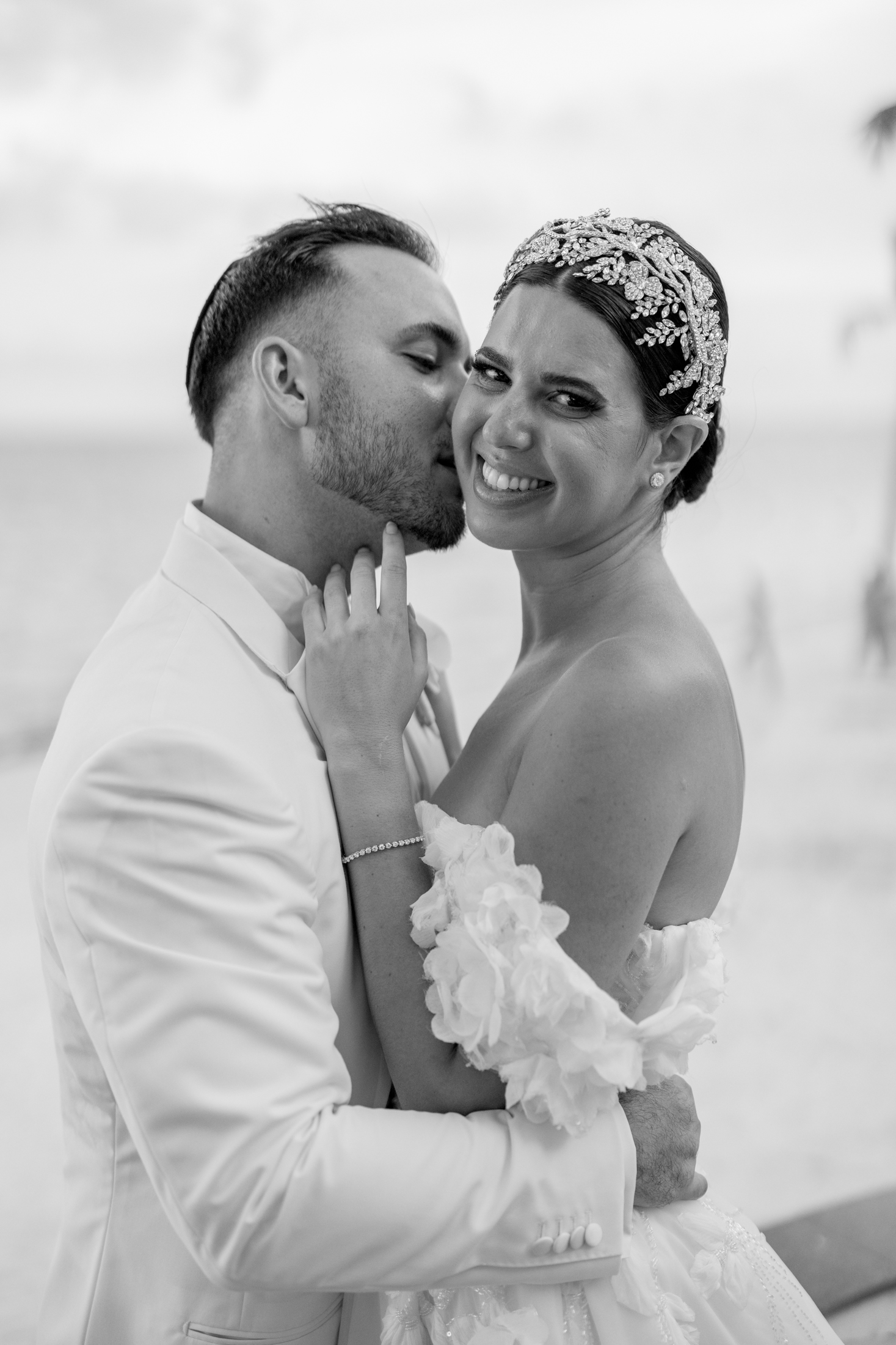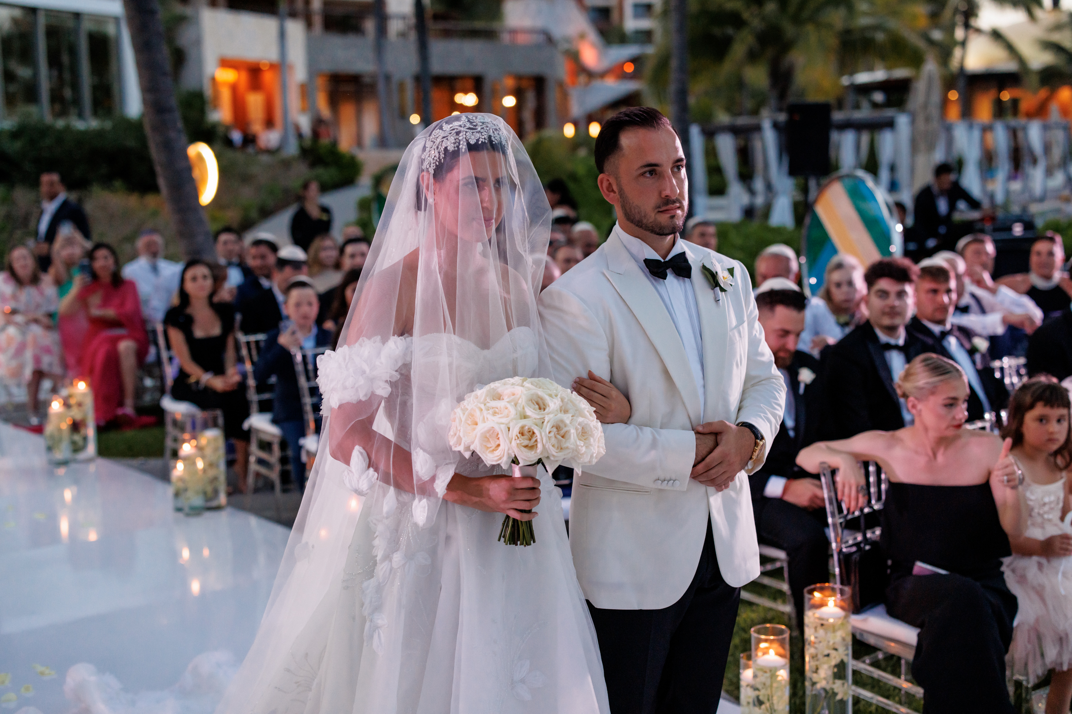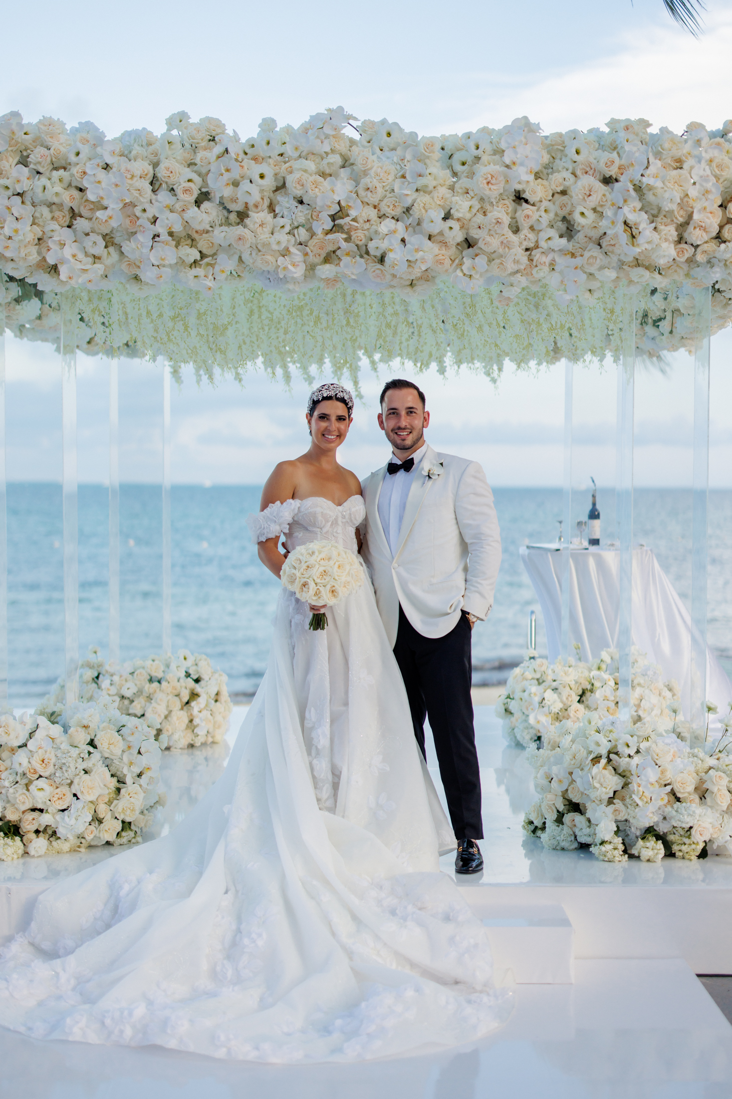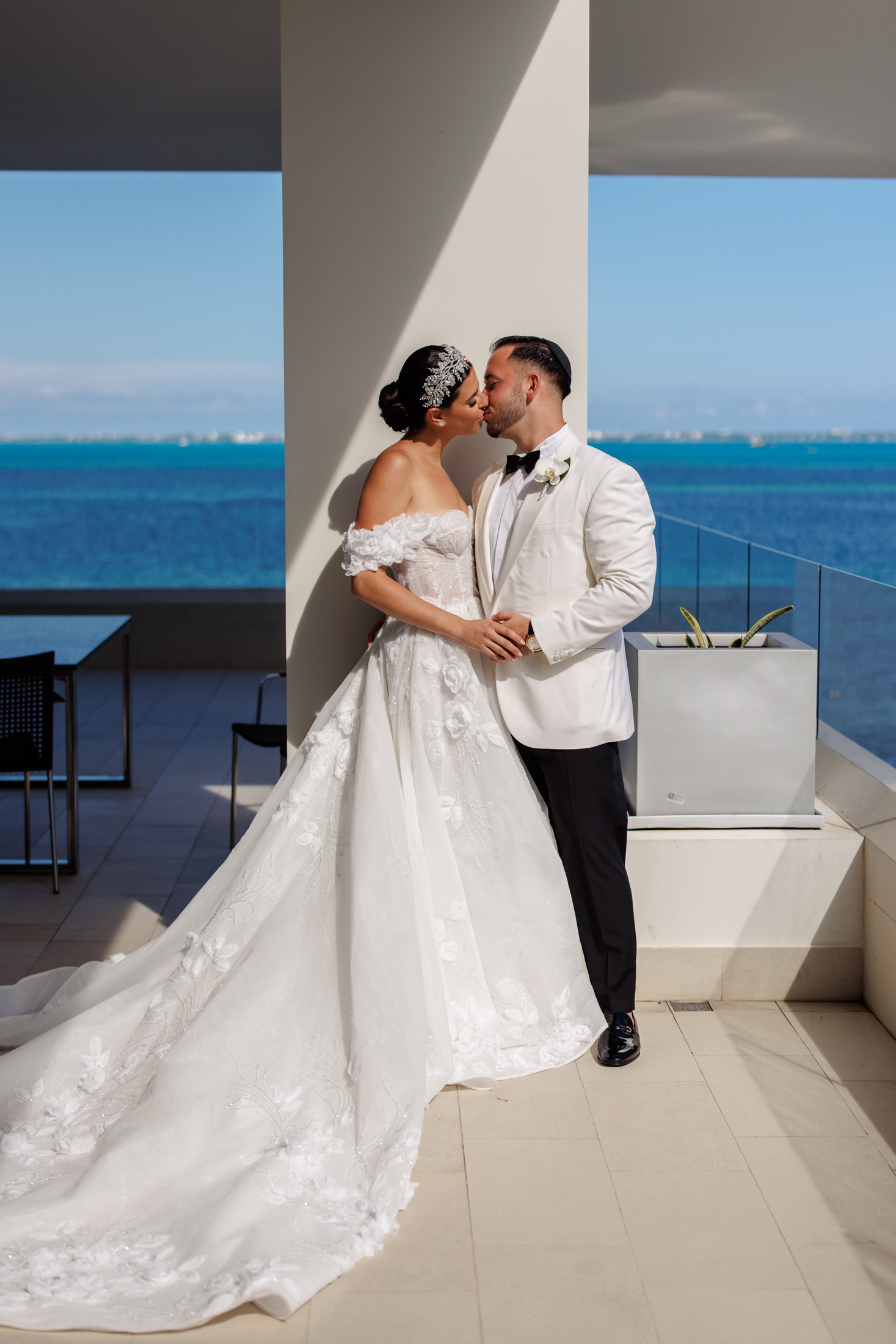 Sabrina & Michael exchanged their vows on the beach, under a chuppah, a wedding canopy that symbolizes the new home of the couple. The chuppah was decorated with white fabric and flowers in gentle shades of white and pink, creating a contrast with the blue sky and the turquoise sea. Sabrina wore a gorgeous white lace dress with a long train and a veil, while Michael wore a white tuxedo with a black pants. The bow tie and boutonniere crowned his look with a flair of refinement. The ceremony was officiated by a rabbi and followed the Hebrew traditions. The guests cheered “Mazel tov!” as the couple kissed and walked down the aisle.