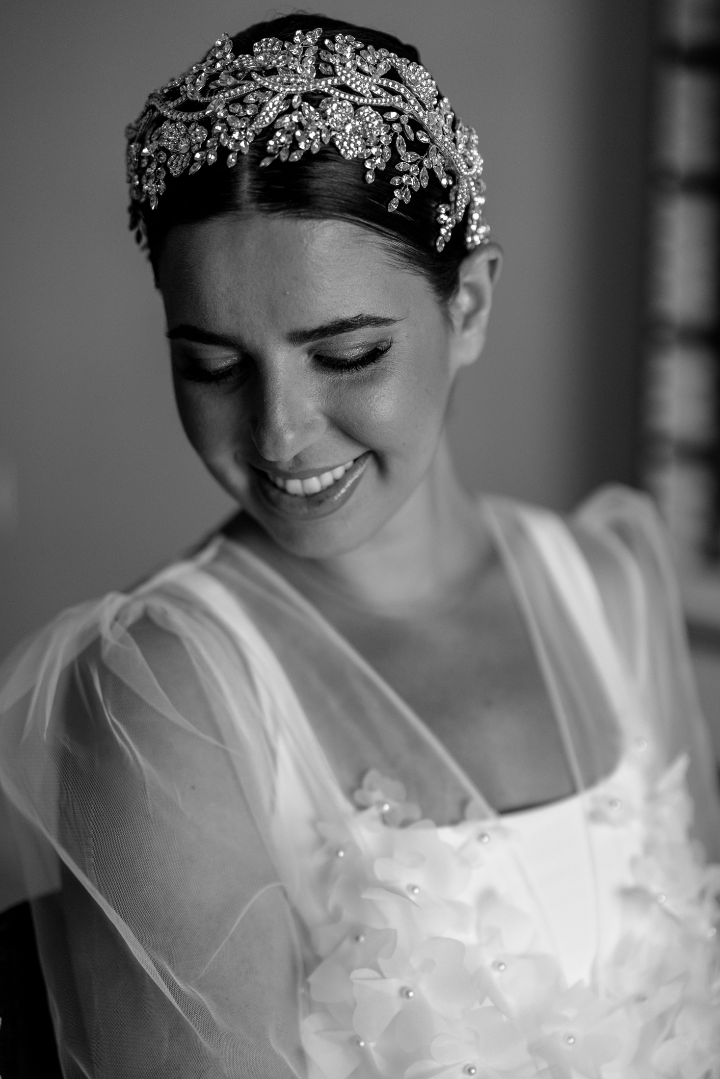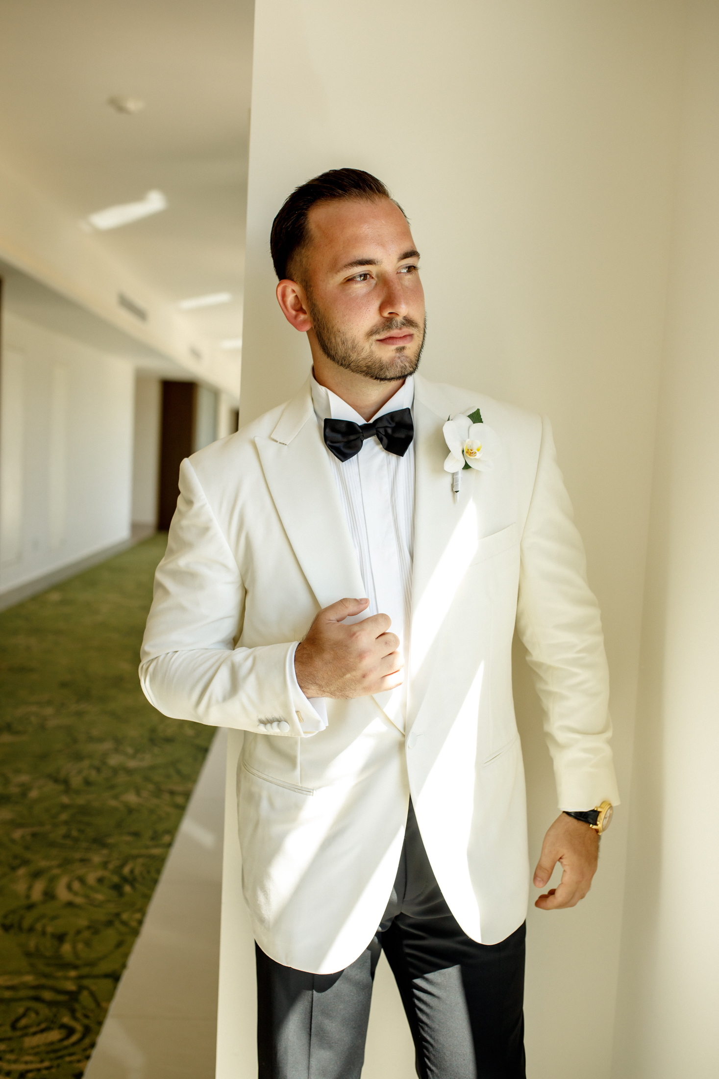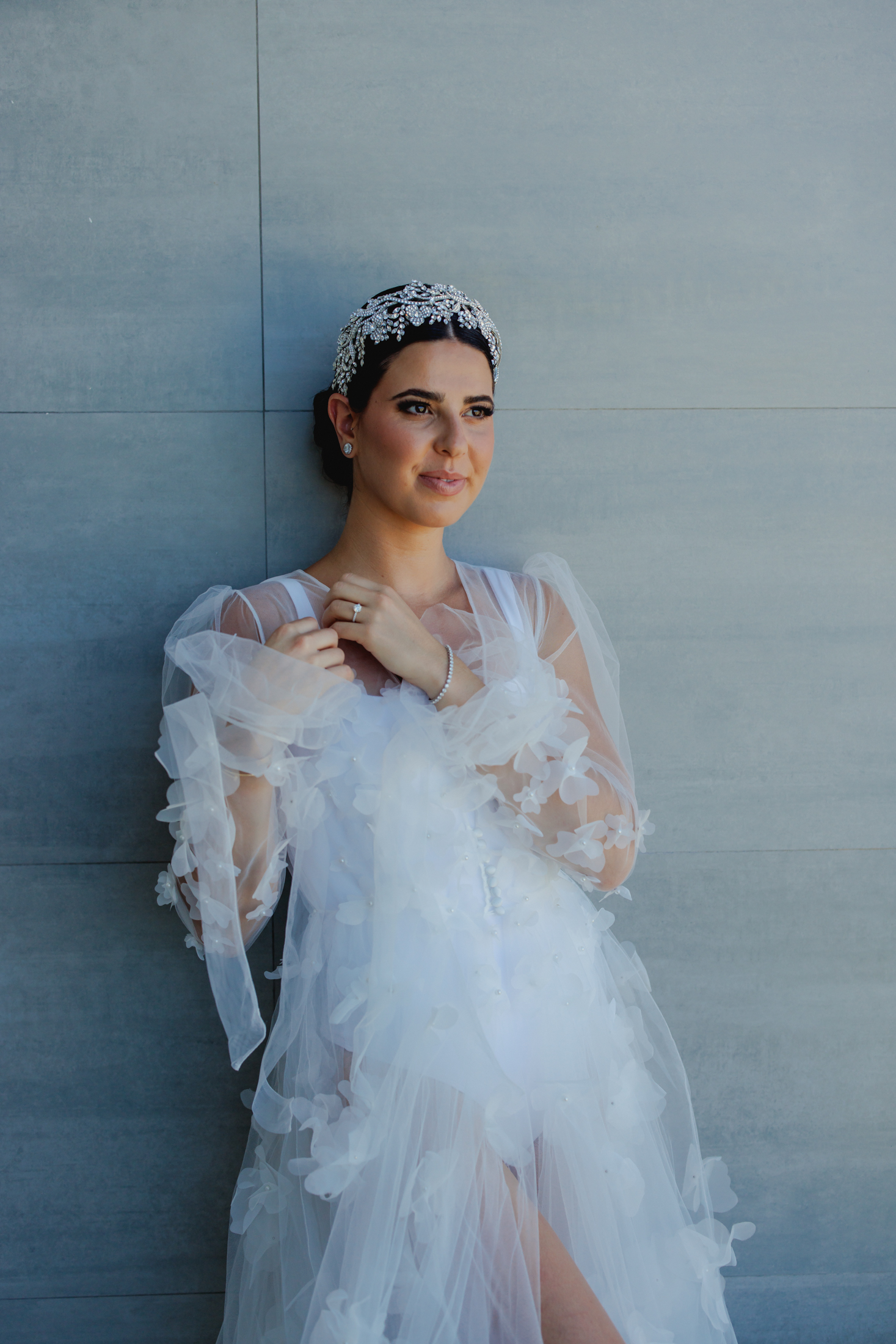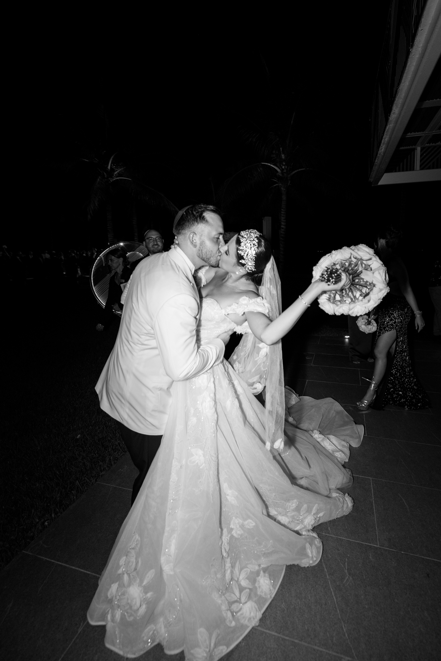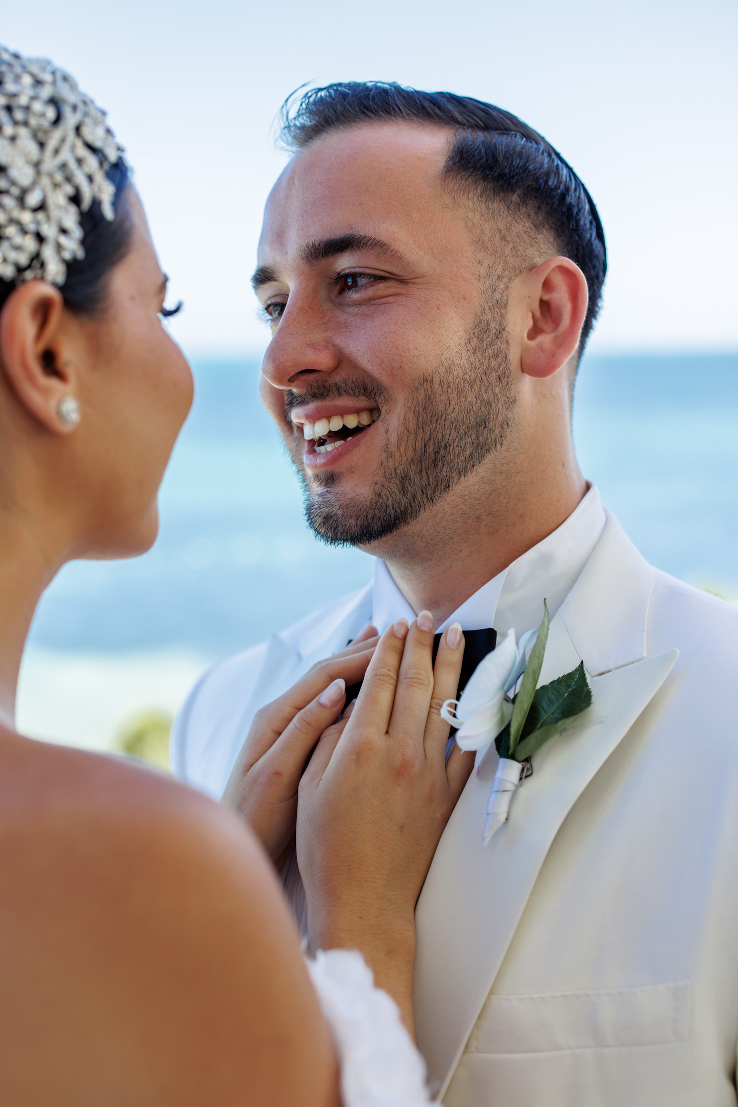 Sabrina & Michael exchanged their vows on the beach, under a chuppah, a wedding canopy that symbolizes the new home of the couple. The chuppah was decorated with white fabric and flowers in gentle shades of white and pink, creating a contrast with the blue sky and the turquoise sea. Sabrina wore a gorgeous white lace dress with a long train and a veil, while Michael wore a white tuxedo with a black pants. The bow tie and boutonniere crowned his look with a flair of refinement. The ceremony was officiated by a rabbi and followed the Hebrew traditions. The guests cheered “Mazel tov!” as the couple kissed and walked down the aisle.