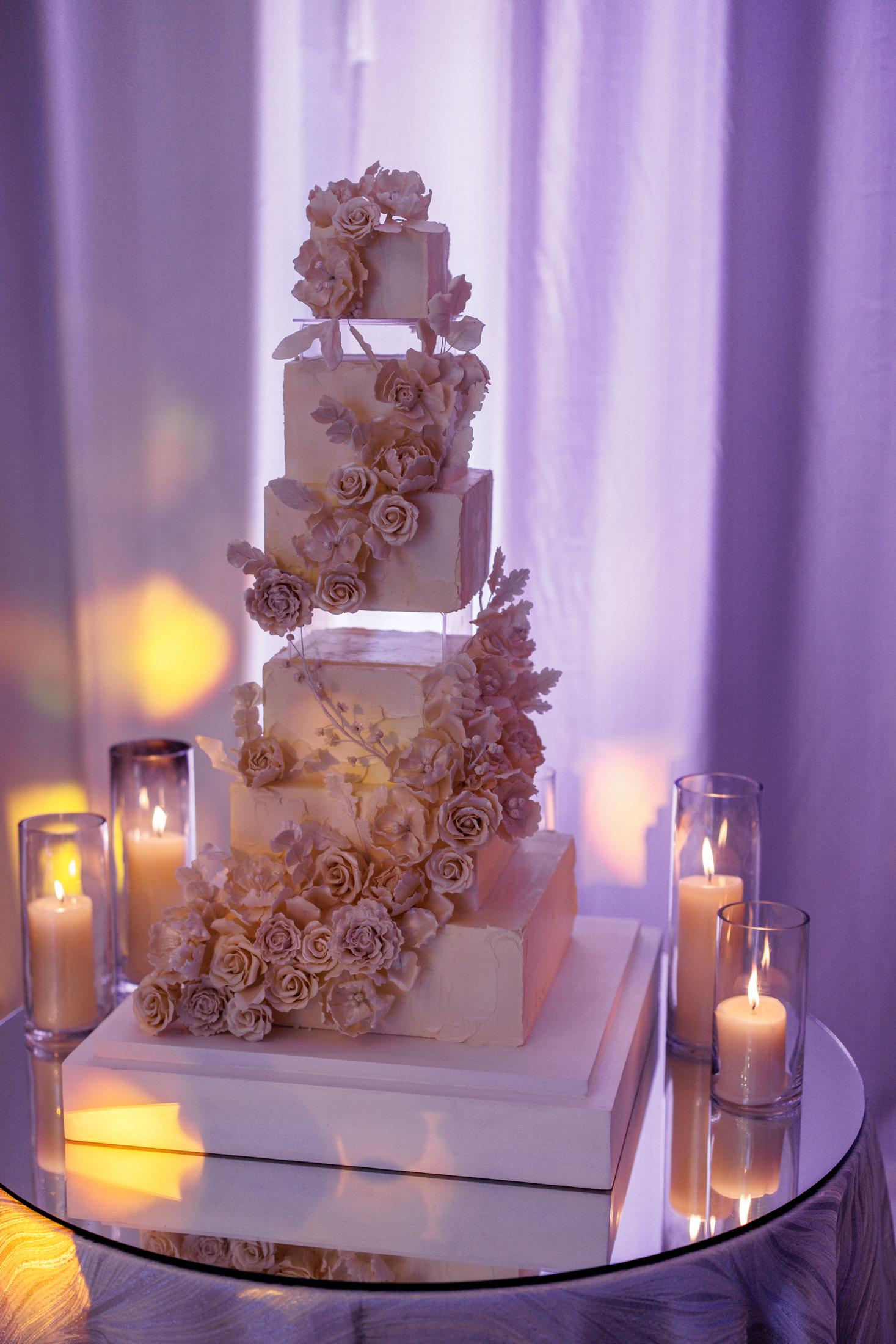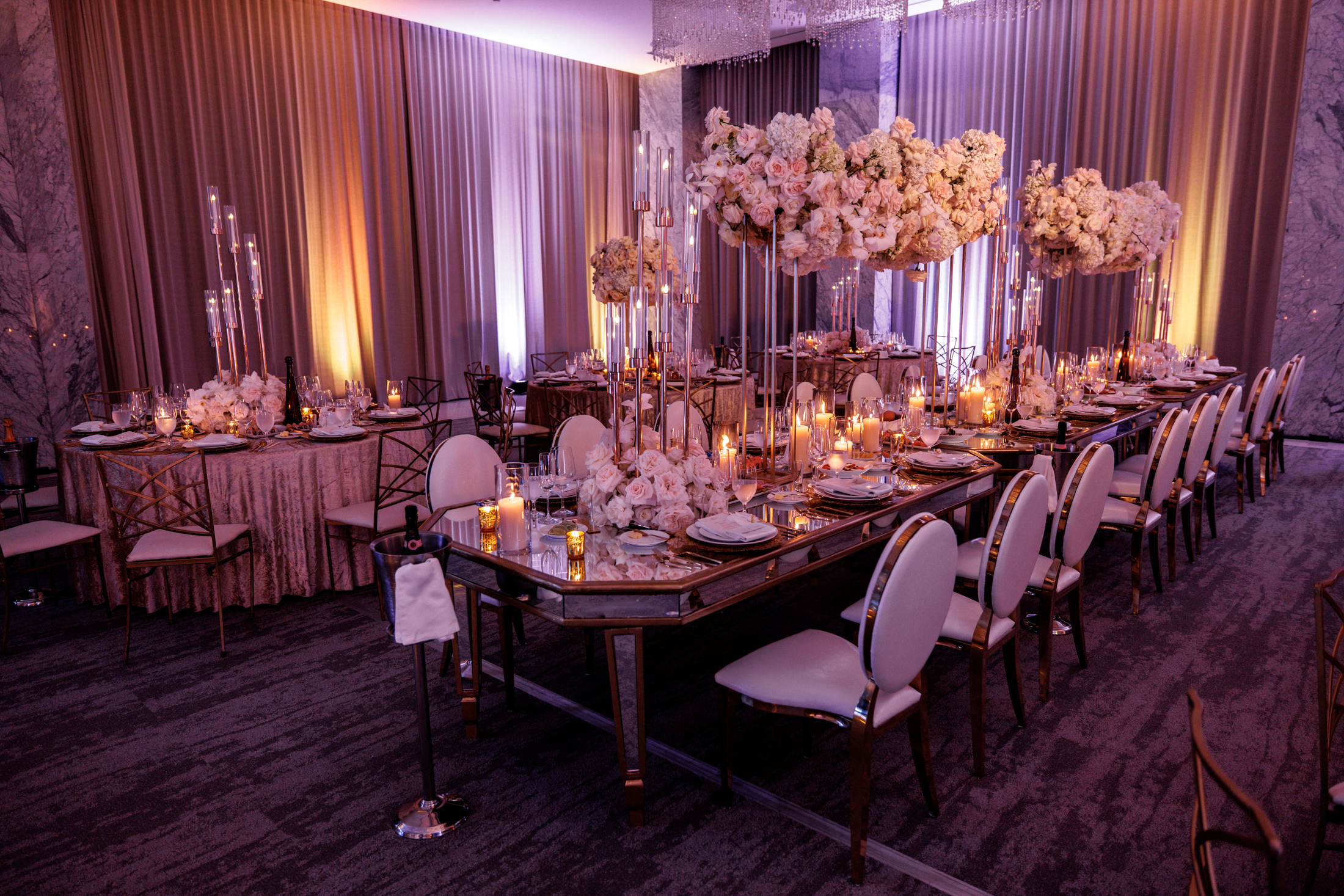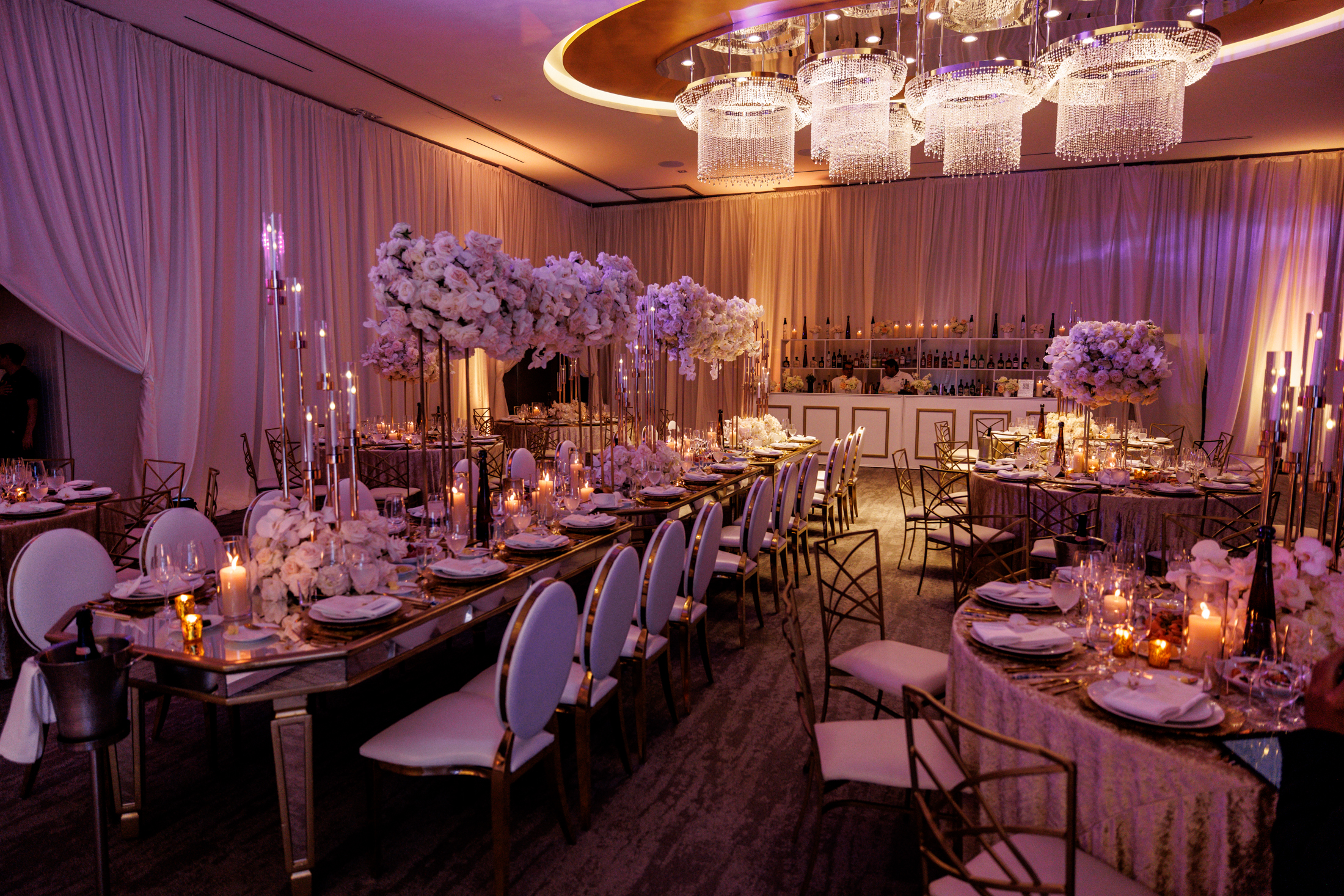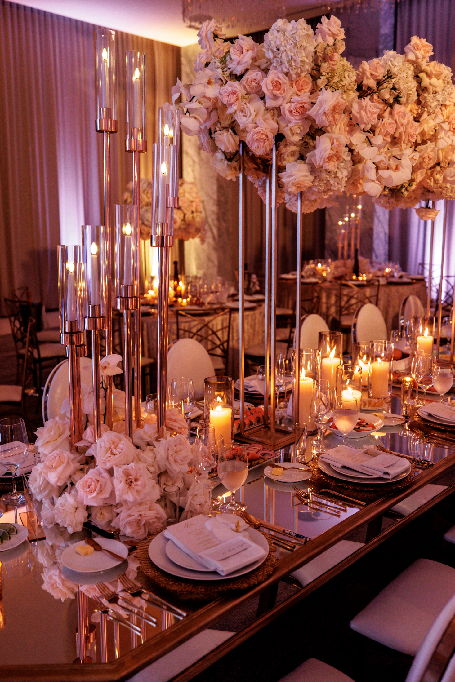 After the ceremony, the guests were transported to a different location for the reception. The couple wanted to surprise their guests with a wow effect, and they succeeded. As the guests arrived at the reception venue, they were greeted by a live band and dancers, who invited them to join the party. The reception venue decor was stunning, with mirror tables, white flowers, candles, and gold accents. The lighting was soft and romantic, creating a cozy and elegant atmosphere.