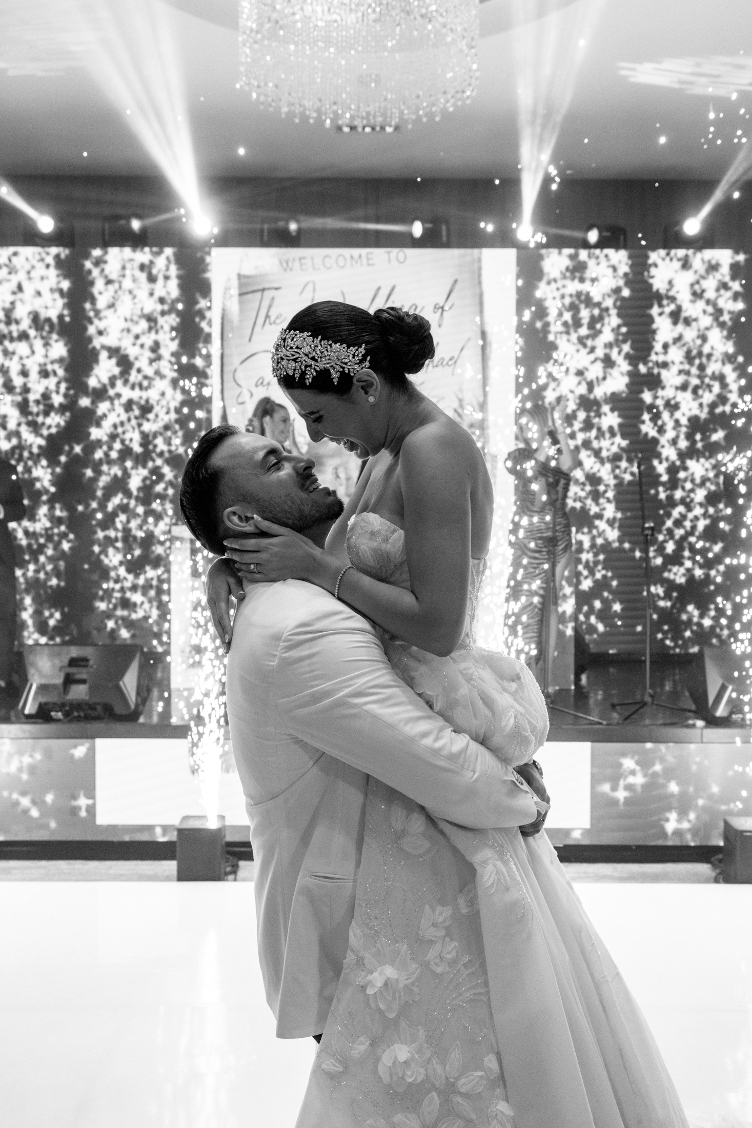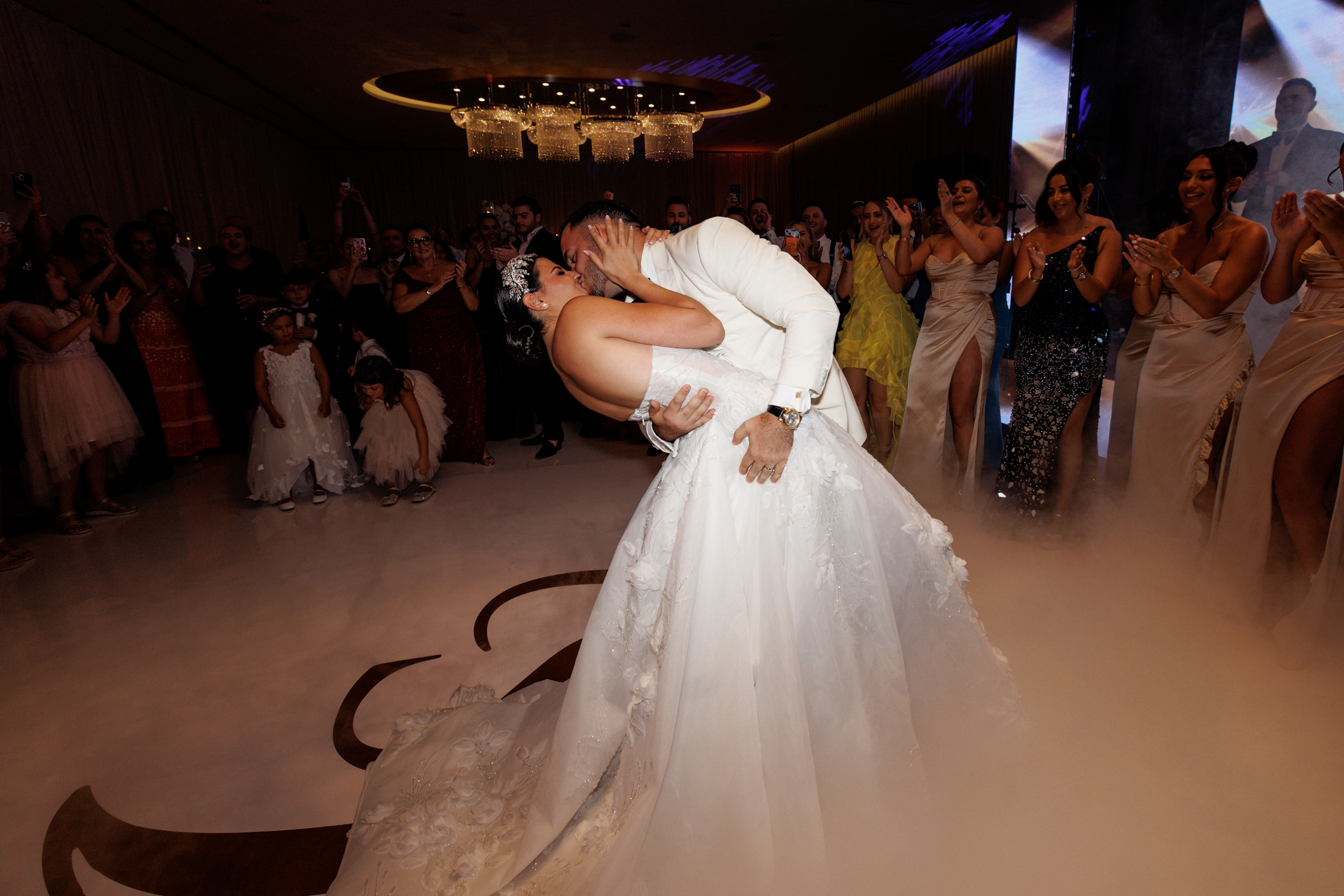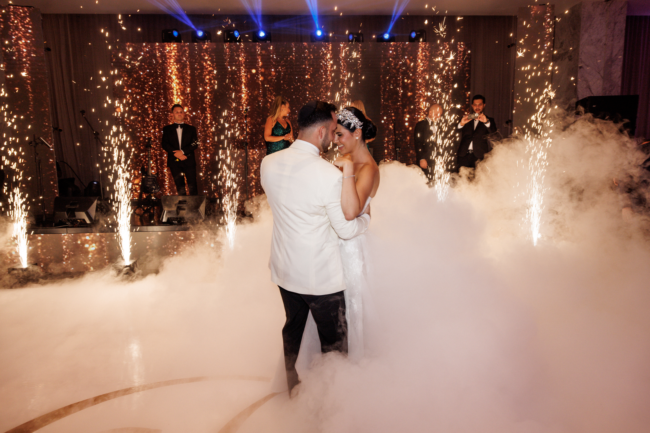 The first dance of Sabrina and Michael was a magical moment that took place on a dance floor covered with decorative smoke and sparklers. The couple danced to a romantic song while a wall of video sparkles created a dazzling effect behind them. The guests joined them on the dance floor and celebrated with them until the end of the night.