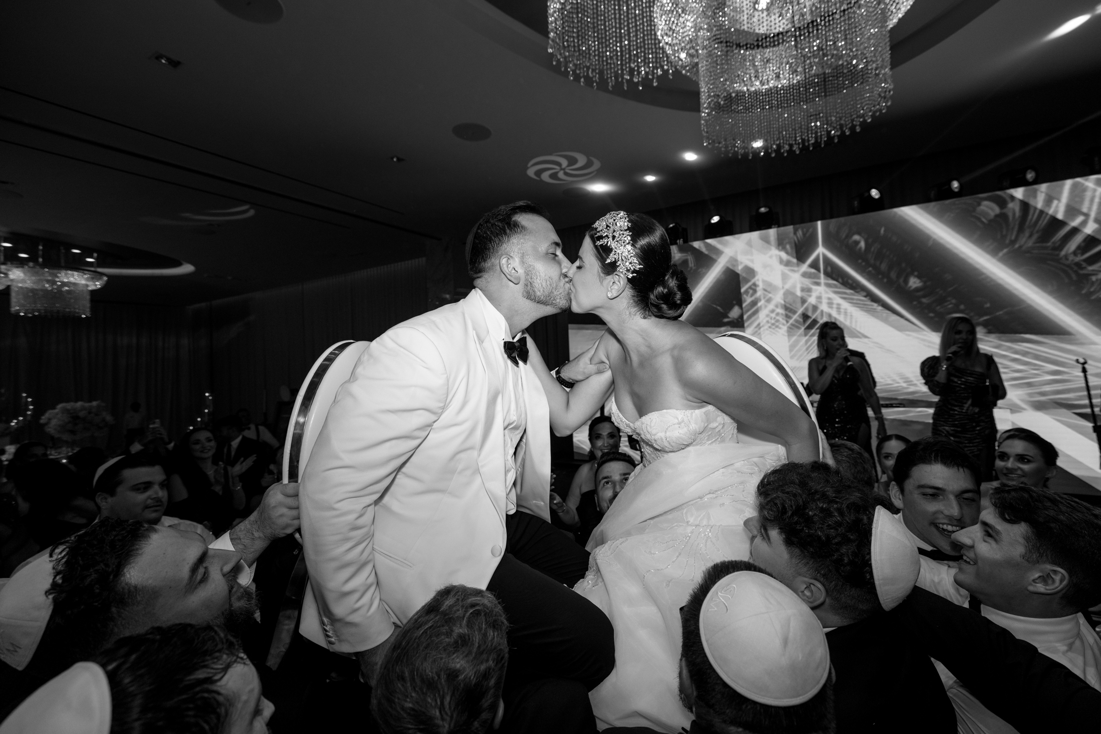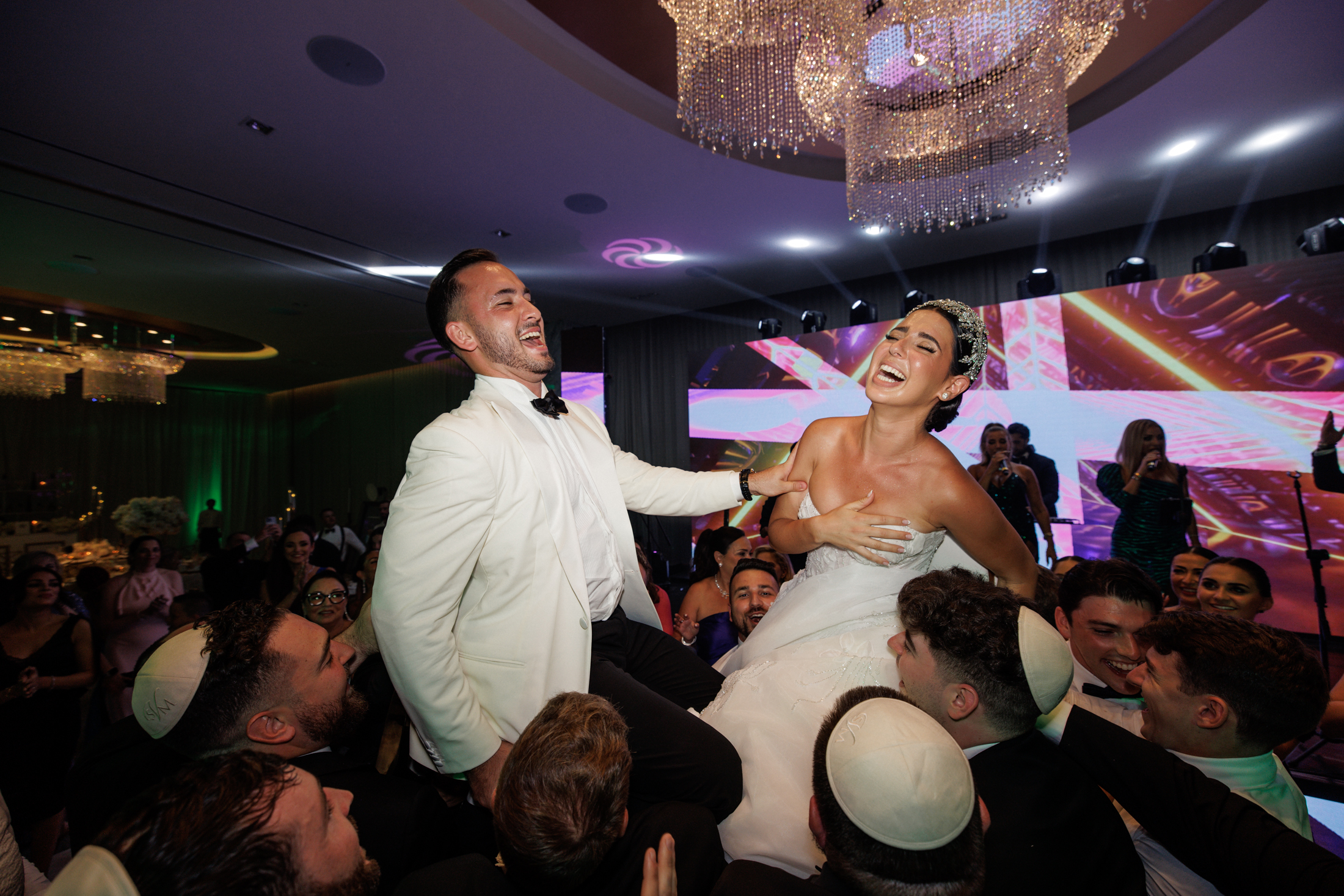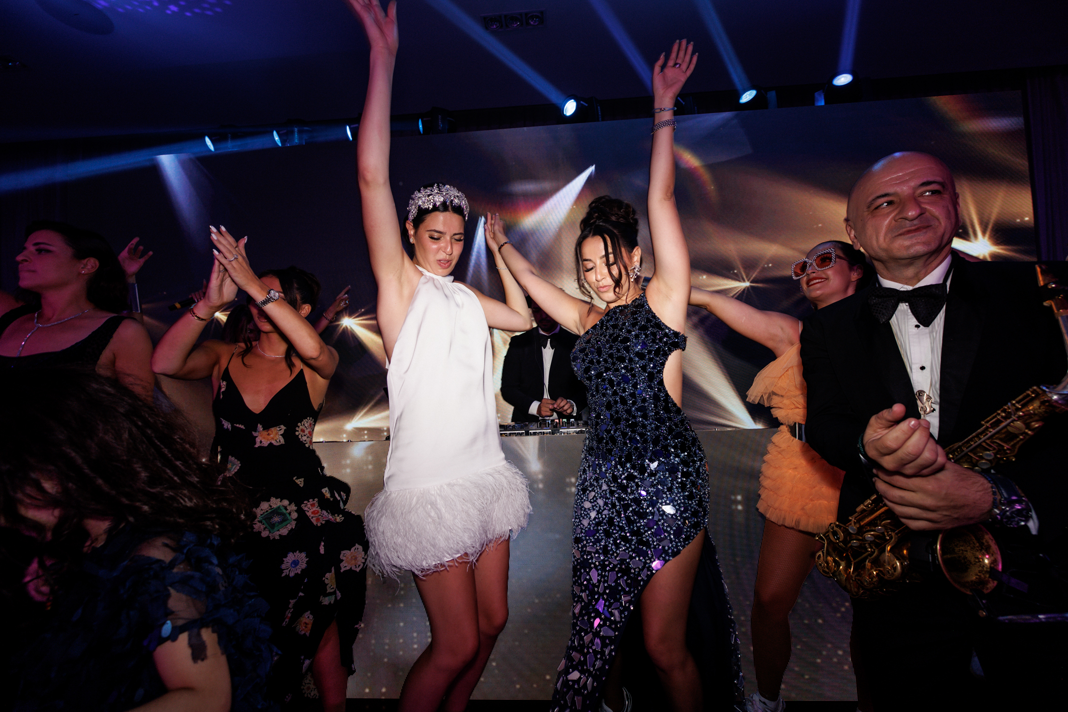 The first dance of Sabrina and Michael was a magical moment that took place on a dance floor covered with decorative smoke and sparklers. The couple danced to a romantic song while a wall of video sparkles created a dazzling effect behind them. The guests joined them on the dance floor and celebrated with them until the end of the night.